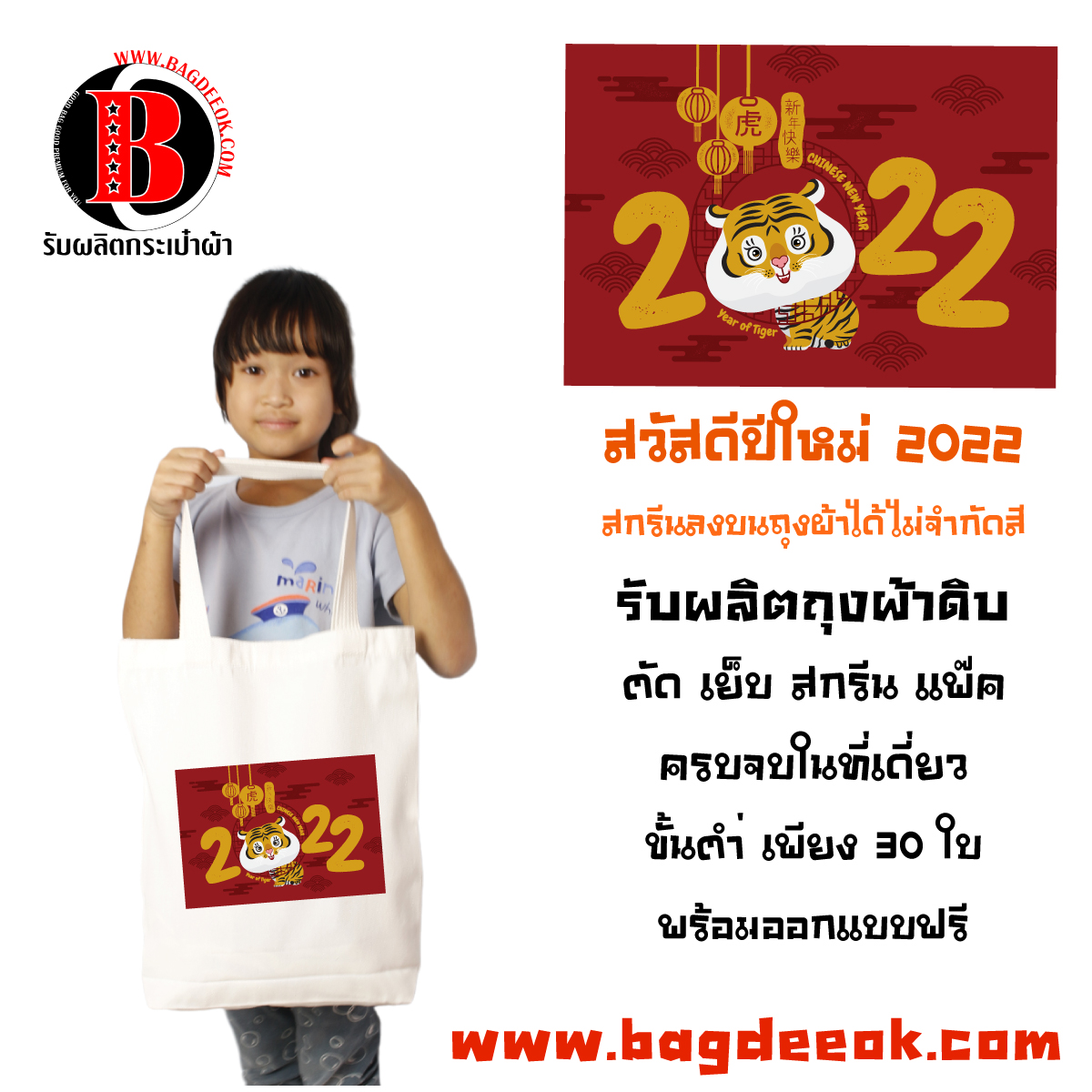 ขั้นตำ่ที่ทางร้านรับผลิตถุงผ้าดิบ พร้อมสกรีนสำหรับเเจกงานปีใหม่ เพียง 30 ใบเท่านั้น ในราคาเบาเบาเเน่นอน